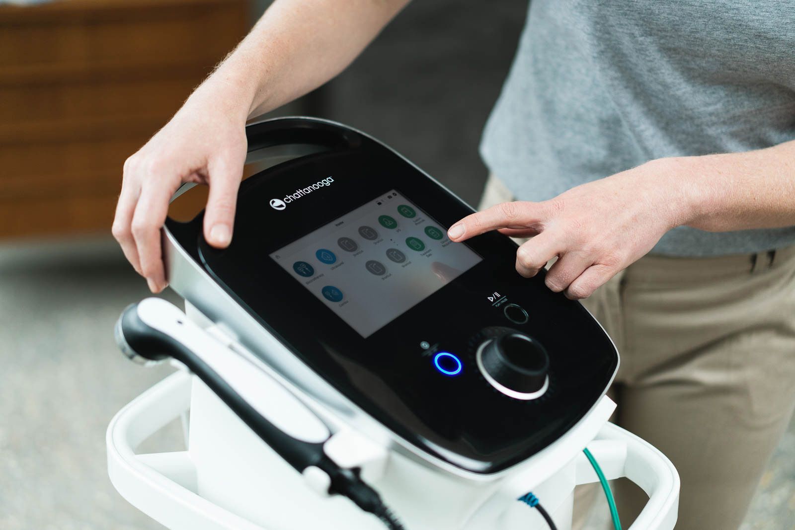 Chattanooga Intellect Mobile Combo 2 with standard accessories. Touch Screen. 2 Channel Electrotherapy with Fully Functional Interferential, VMS, High Volt ( optional item) , Asymetric Biphasic Tens , Symmetric Biphasic Tens and 1 & 3Mhz Ultrasound Treatments and standard accessories. (Without System Trolley ) with Ultrasound head one pcs 5 cm . Manufactured By Chattanooga USA